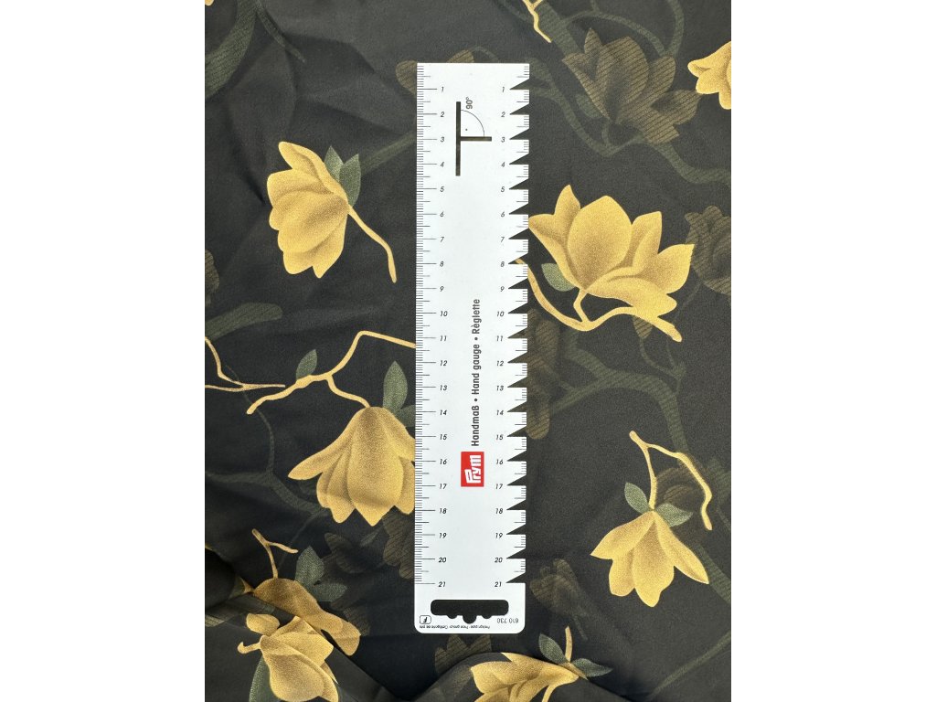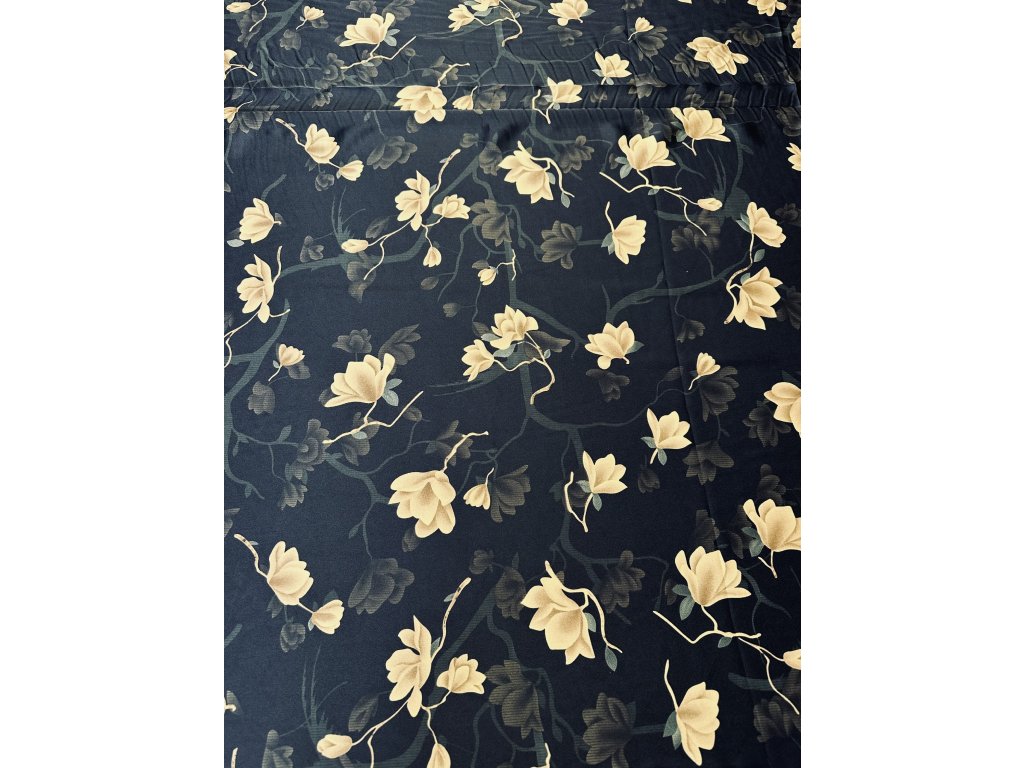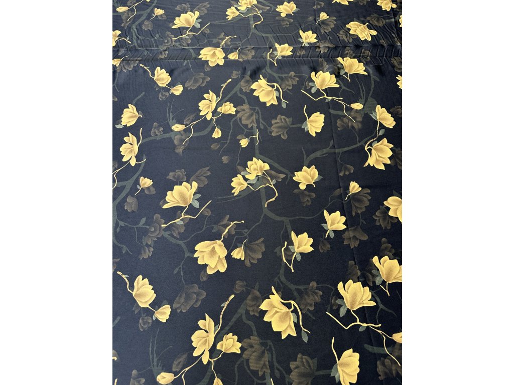 Umělé hedvábí s elastanem. Zlaté květy na černém podkladu.