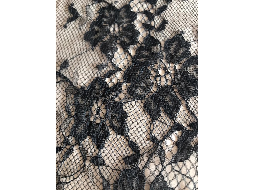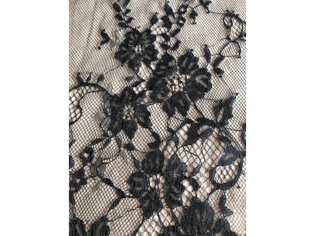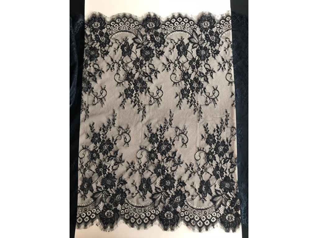 Černá krajka typu Chantilly s jemným květinovým vzorem je ideální volbou pro tvorbu šatů, které vyžadují eleganci a rafinovanost. Bez zdobení korálky nebo flitry, tento materiál potěší krásu svého jemného a úhledného vzoru. Krajka je doplněna bordurou na obou stranách, což umožňuje jednoduchá aplikace a dodává výrobky s dokončeným vzhledem.