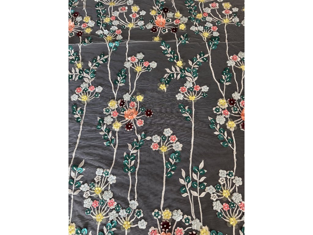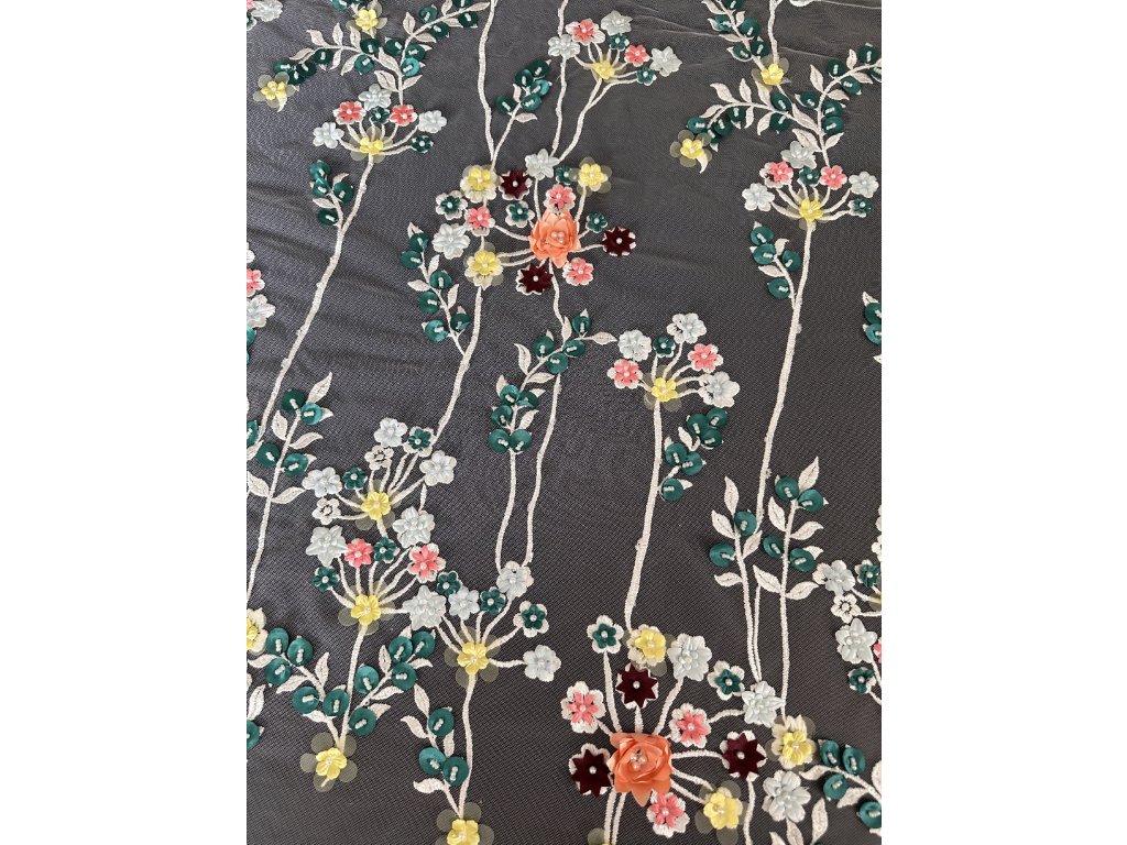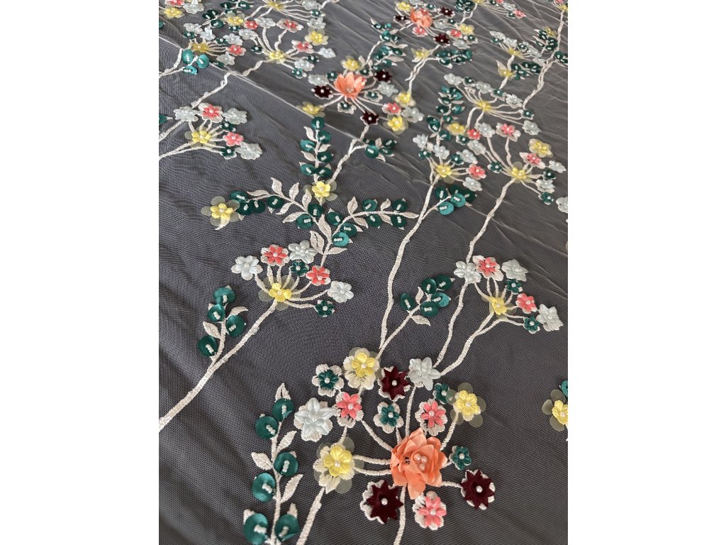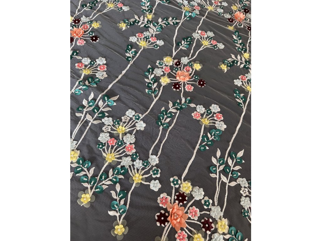 Tato krajka je dokonalou symbiózou přírodních motivů. Drobné větvičky, lístečky a kytičky v 3D provedení poskytují bohatý a detailní vzor, který přidává texturu a vizuální hloubku každému oděvu. Tato krajka je ideální pro ty, kteří hledají okouzlující a sofistikovaný doplněk k svatebním šatům nebo společenským róbám.