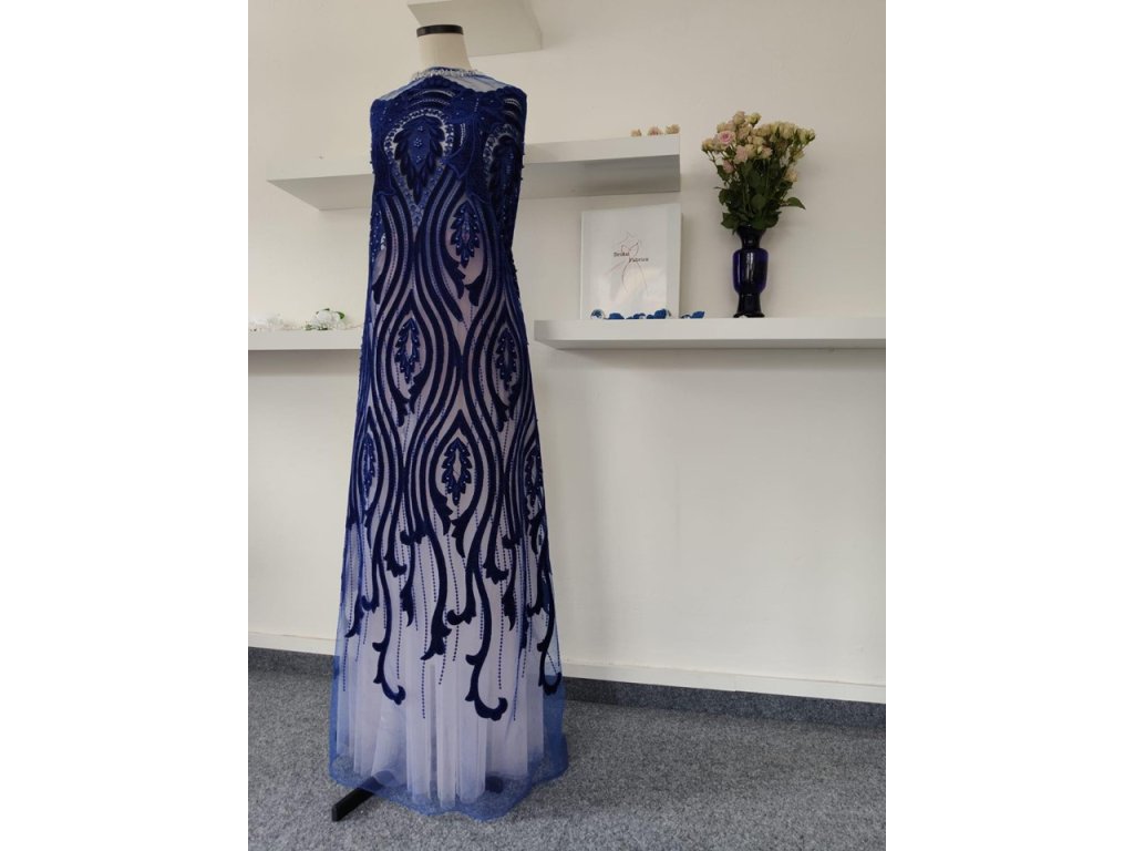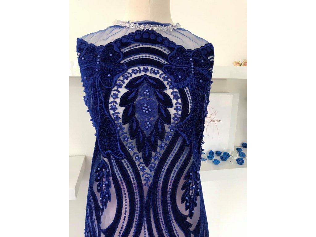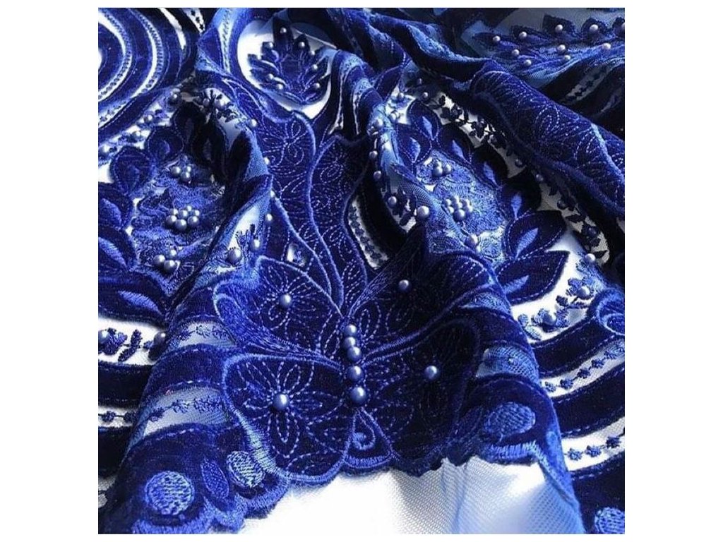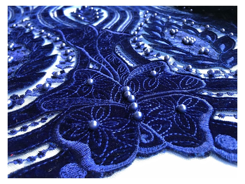 Tato luxusní sametová aplikace na tylu představuje vrchol elegance a rafinovanosti. Královská modř dodává hloubku a bohatství, zatímco zdobení korálků a perliček přináší sofistikovaný třpyt. Tato kombinace představuje aplikaci ideální pro vytvoření výjimečných oděvních kousků, jako jsou večerní šaty, svatební šaty nebo luxusní doplňky.