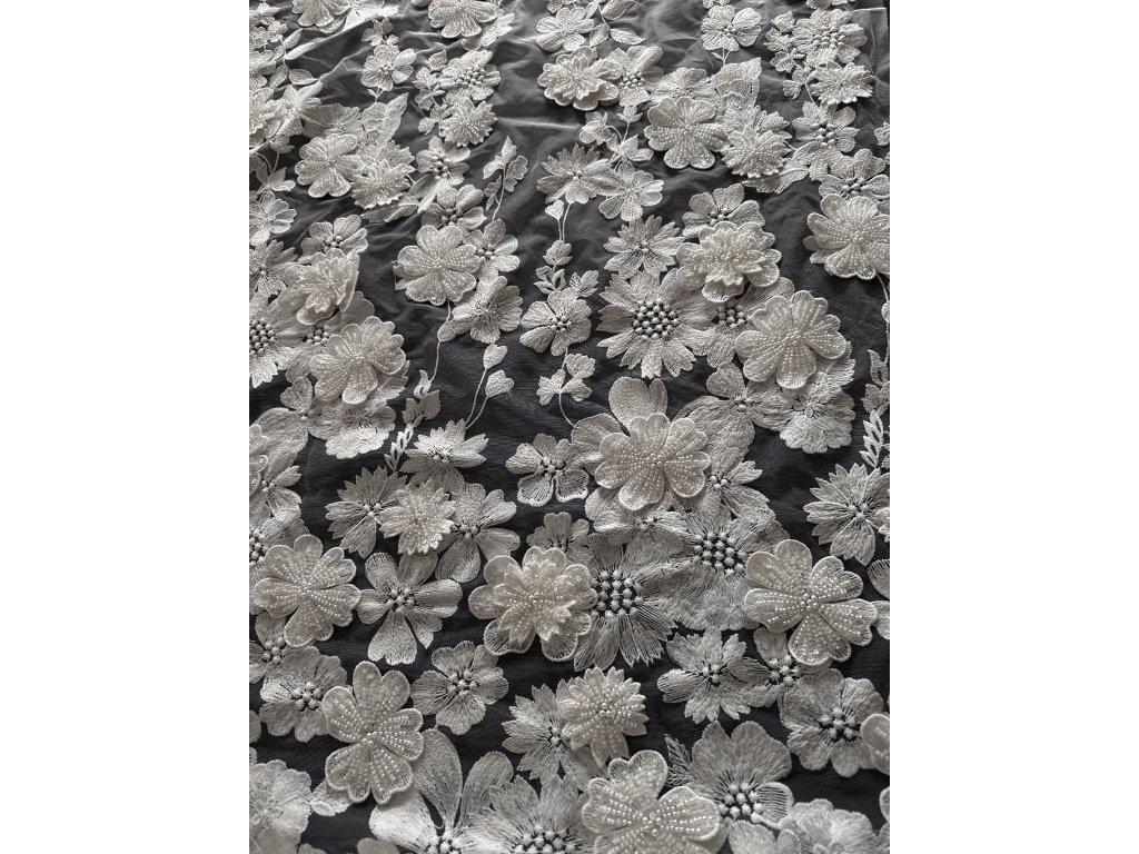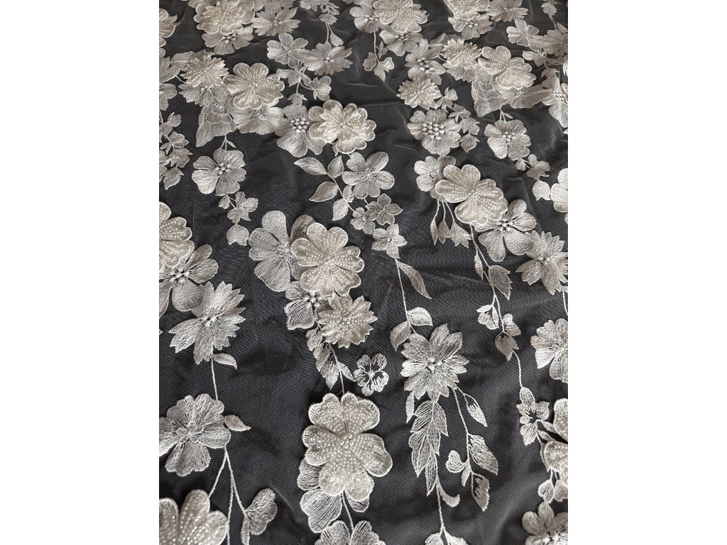 Tato exkluzivní krajka s výšivkou květů po celém plátně přináší dokonalou kombinaci elegance a luxusu. Bohaté zdobení flitry a korálky různého průměru dodává látce oslnivý třpyt a vizuální hloubku. Výjimečně detailní provedení této krajky je ideální pro sofistikované svatební i společenské šaty a dekorativní doplňky.