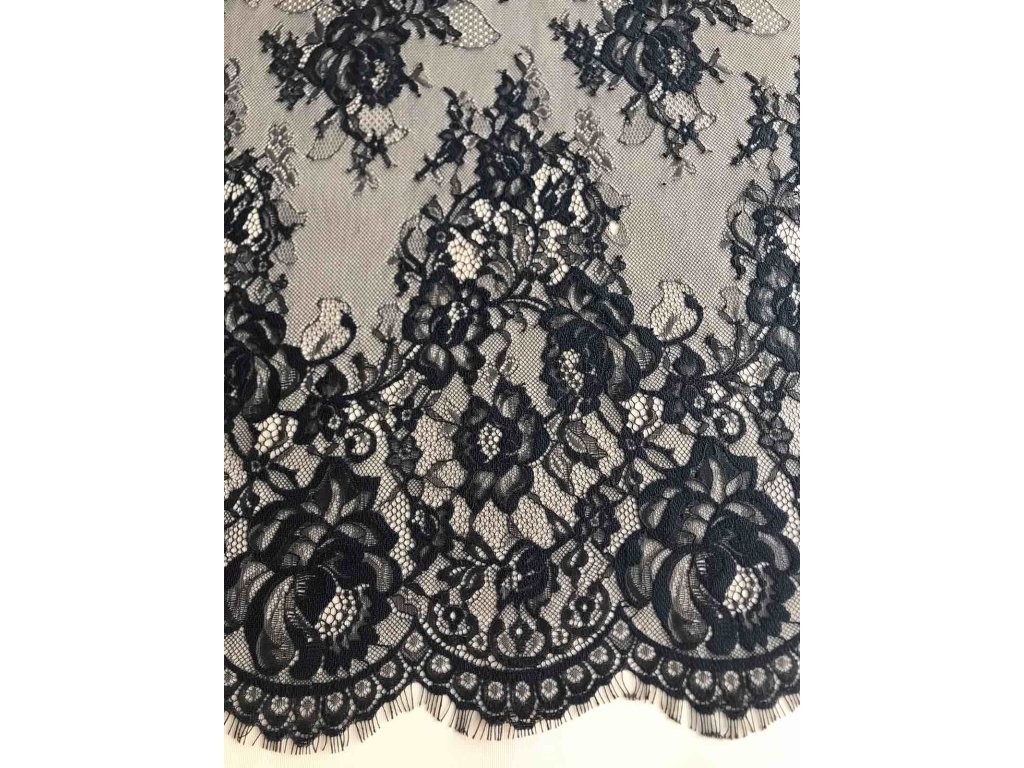 Černá krajka typu Chantilly s jemným květinovým vzorem je ideální volbou pro tvorbu šatů, které vyžadují eleganci a rafinovanost. Bez zdobení korálky nebo flitry, tento materiál potěší krásu svého jemného a úhledného vzoru. Krajka je doplněna bordurou na obou stranách, což umožňuje jednoduchá aplikace a dodává výrobky s dokončeným vzhledem.