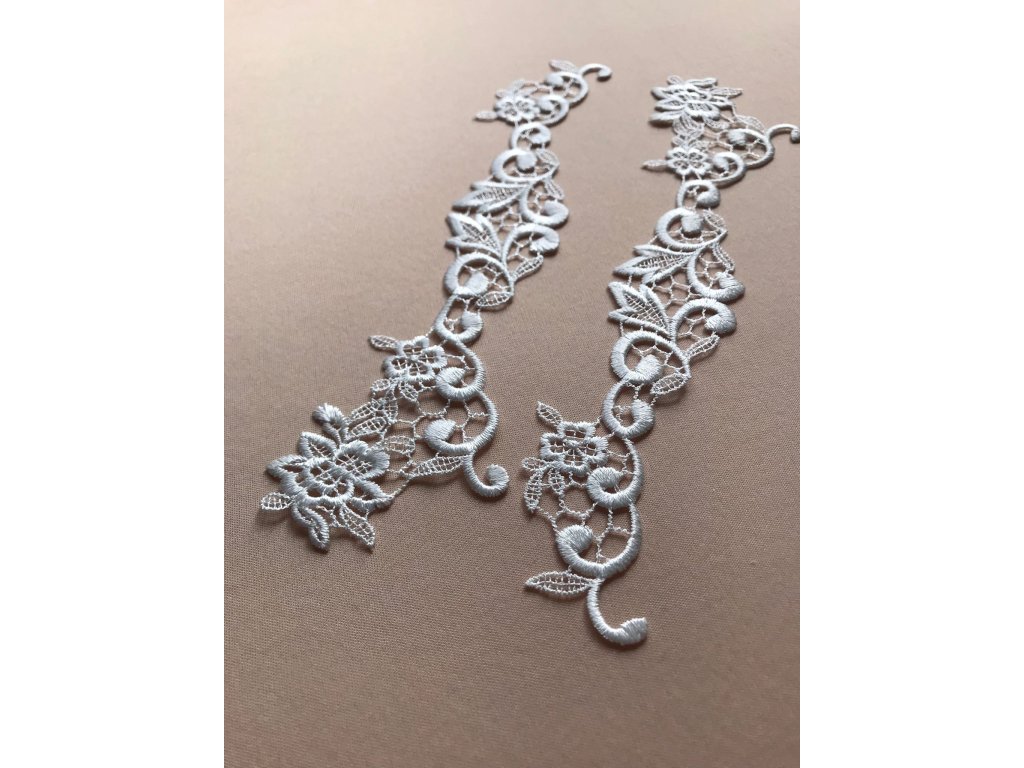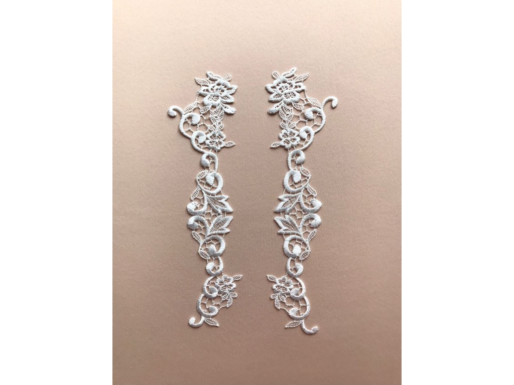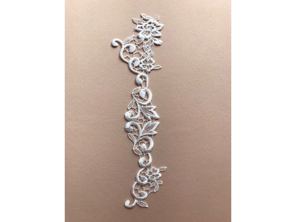 Jemná a hladká krajková aplikace je ideální pro lemování nebo vytvoření vlastního vzoru na svatebních šatech, večerních róbách, sukních a dalších oděvních kouscích. Tato krajka přidává elegantní a sofistikovaný detail, který zvýrazní každý design. Díky své jemnosti a hladkému povrchu je perfektní pro přesné aplikace a tvorbu originálních vzorů na různé typy oděvů.