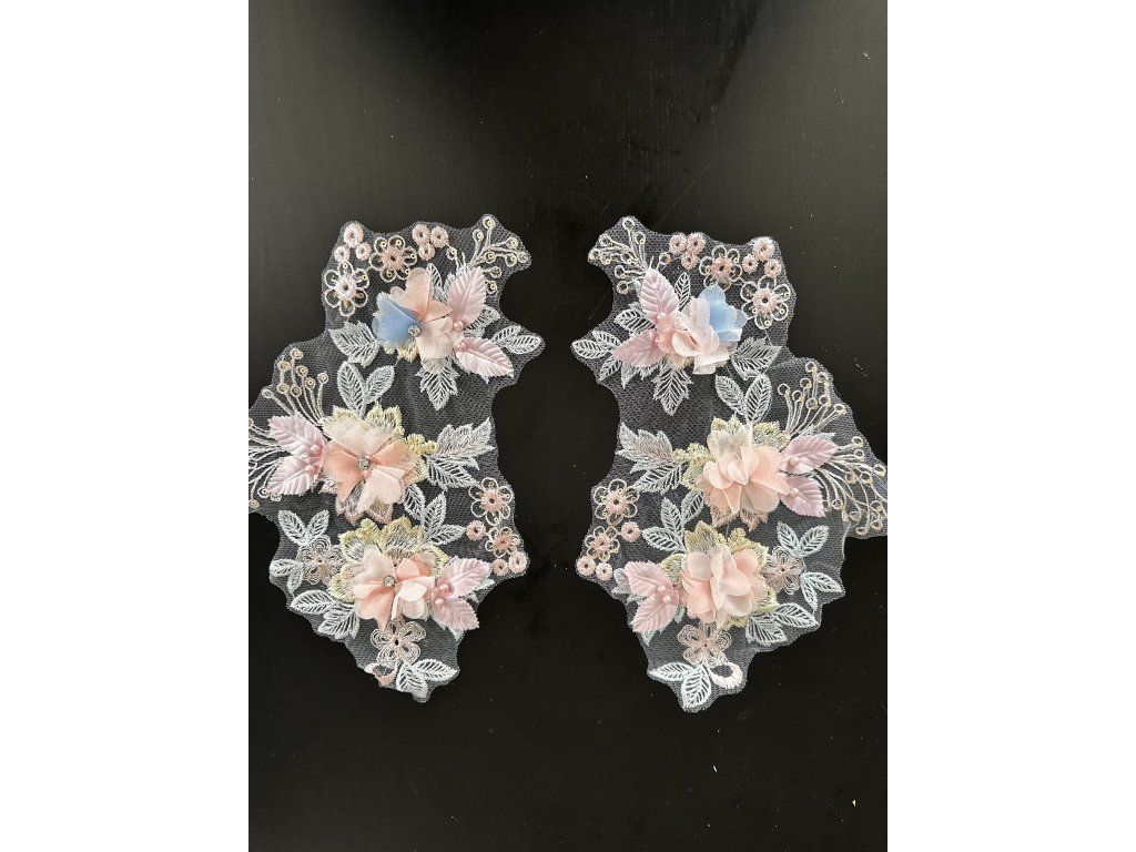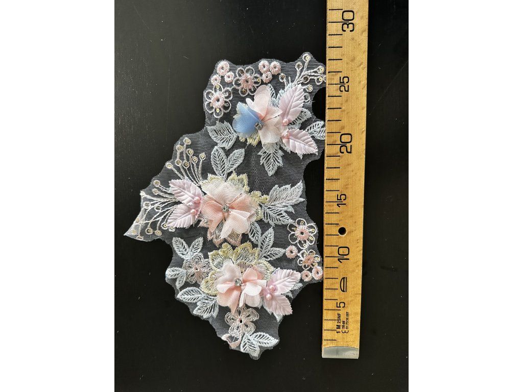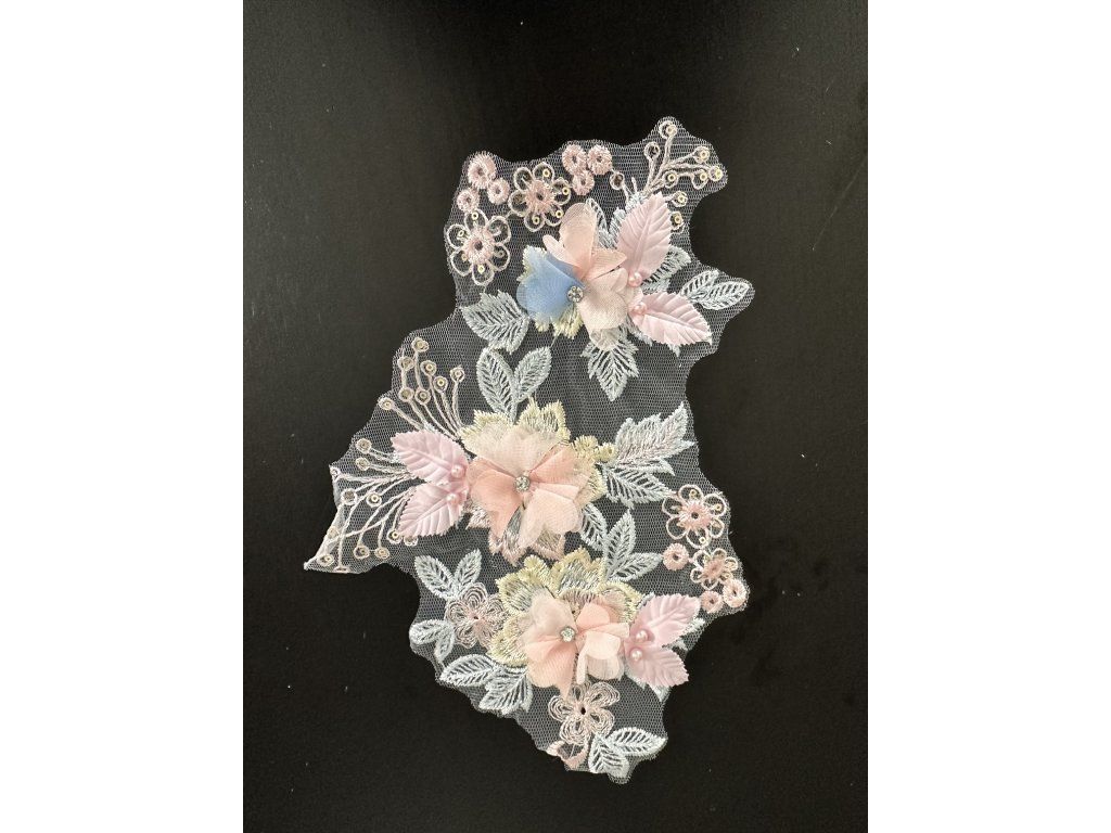 Krajková aplikace s 3D kytičkami v pastelových barvách.