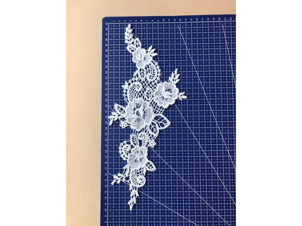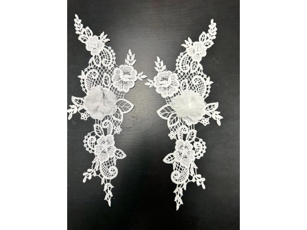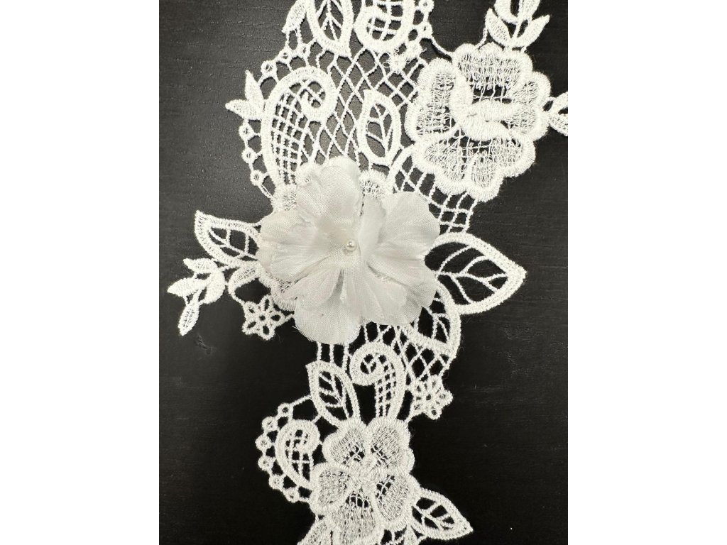Krajková aplikace typu "macrame" , zdobená průhlednými flitry a doplněná 3D květem , přináší do každého projektu originální a sofistikovaný design. Tato aplikace je ideální pro svatební šaty, večerní šaty nebo dekorace, kde kombinace makramé krajky, jemných flitrů a 3D květu vytváří jedinečný a elegantní efekt. Je perfektní volbou pro ty, kteří hledají výrazné a zároveň vkusné detaily na svých kreacích.