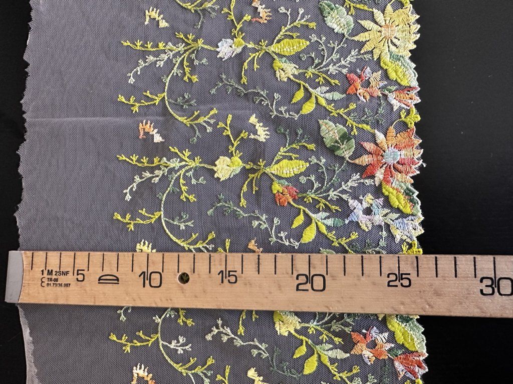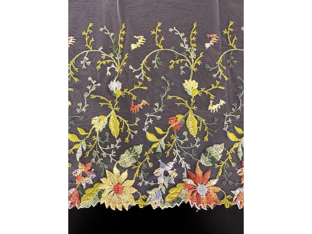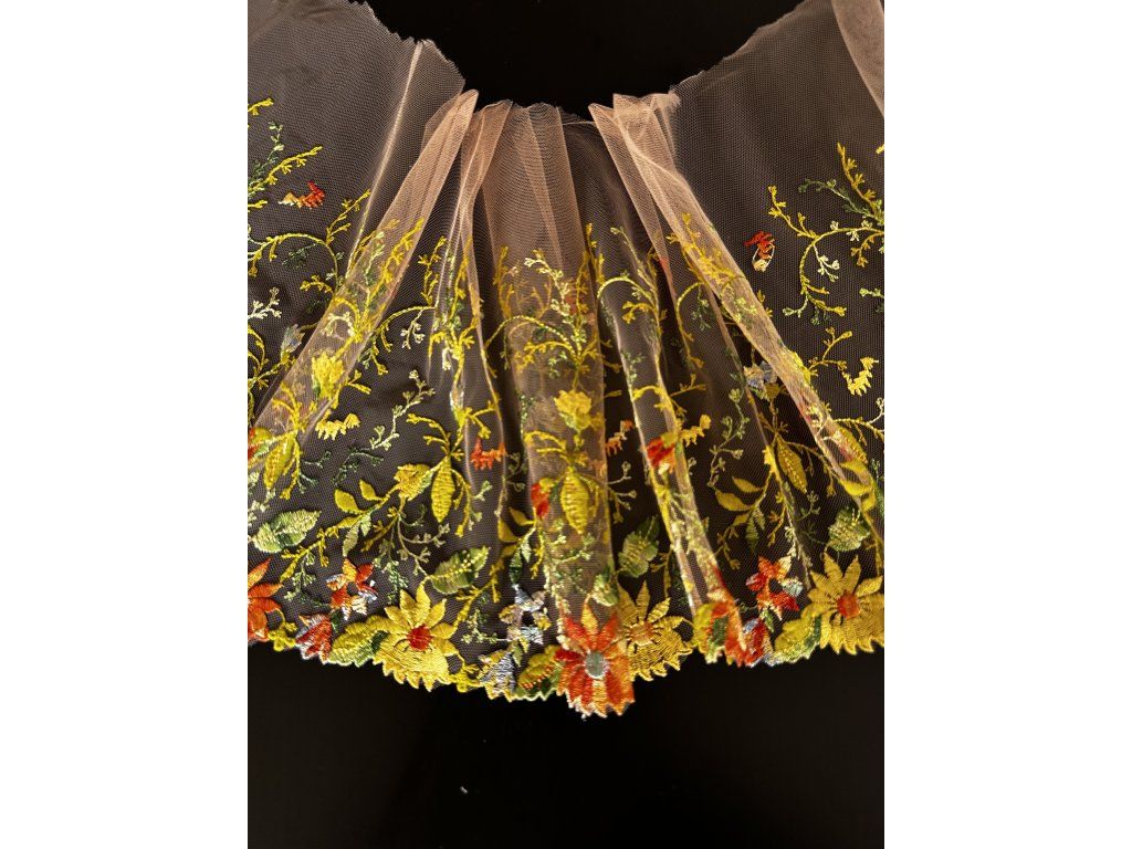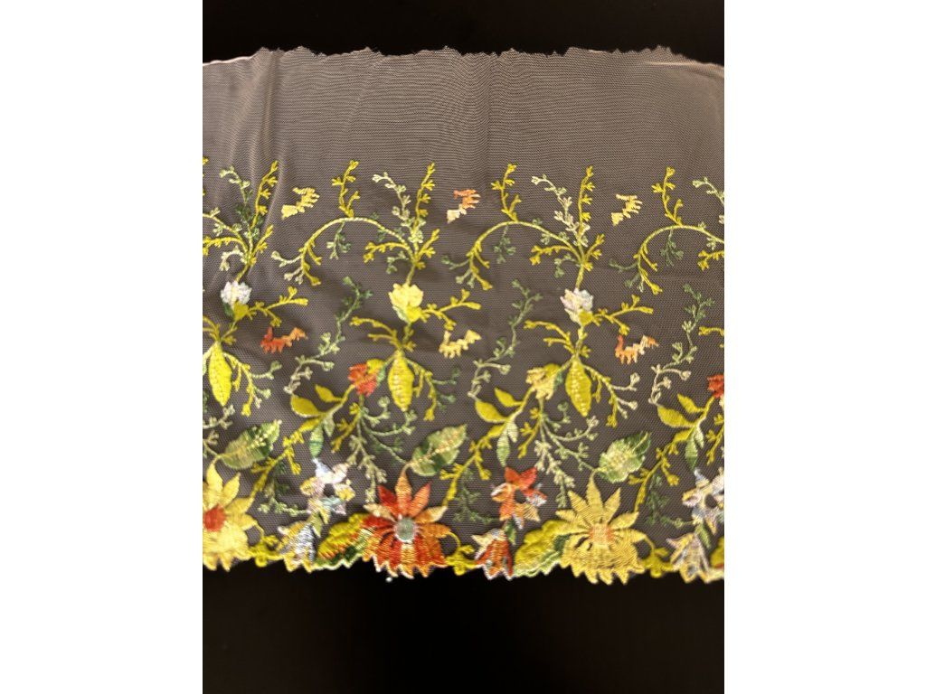 Výšivka na tylu (pruh) s motivem květu. Tento pruh výšivky je ideální pro domácí oblečení, sukně, halenky a další oděvní kousky.