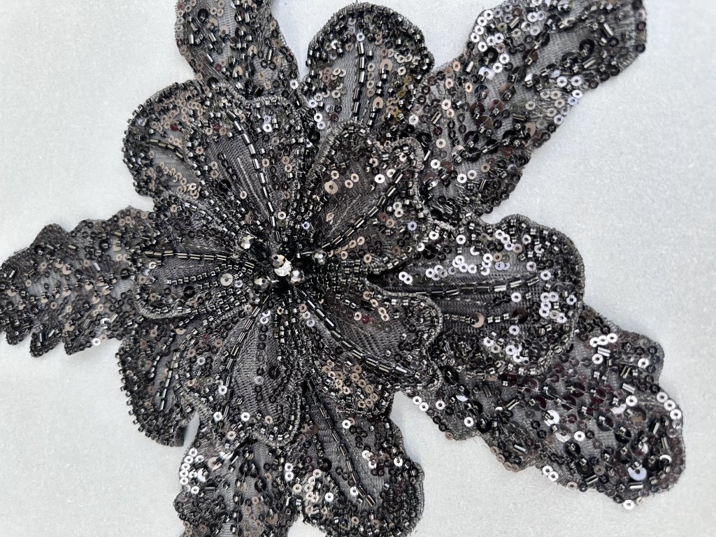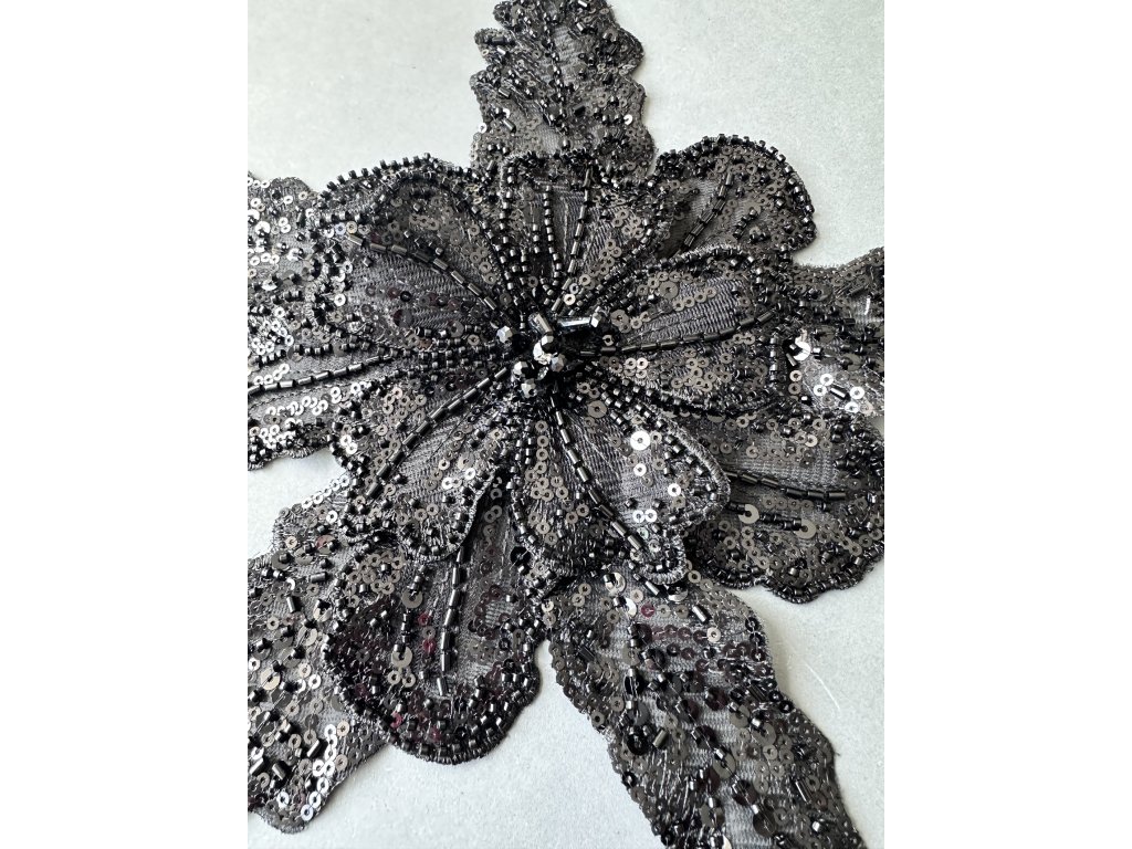 Kusová aplikace zdobená drobnými korálky a flitry je elegantní dekorativní prvek. Tato aplikace může sloužit nejen jako ozdoba na svatební šaty, večerní róby nebo jiné oděvní kousky, ale také jako zajímavý detail na dekoracích. Jemné korálky a flitry dodávají aplikaci třpytivý a sofistikovaný vzhled, ideální pro vytvoření elegantního a luxusního designu.