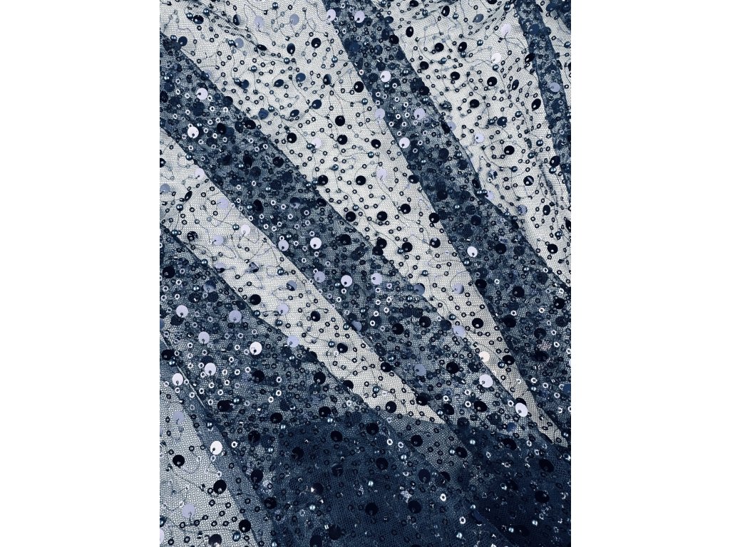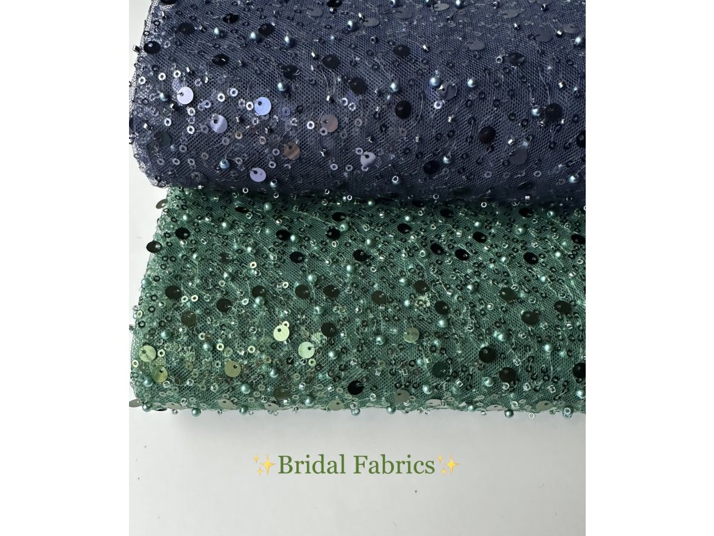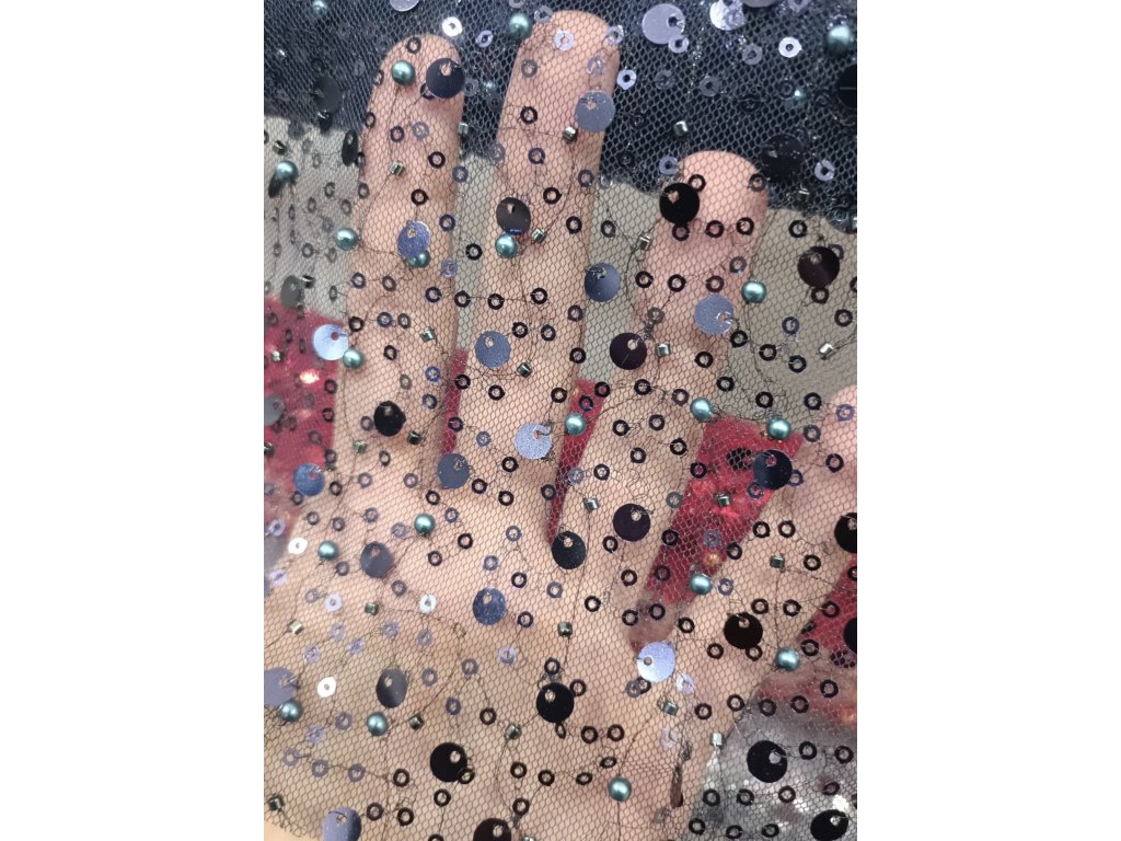 Pružný tyl, hustě zdobený flitry, korálky a perličky.