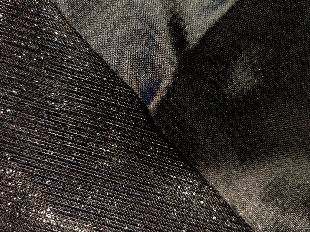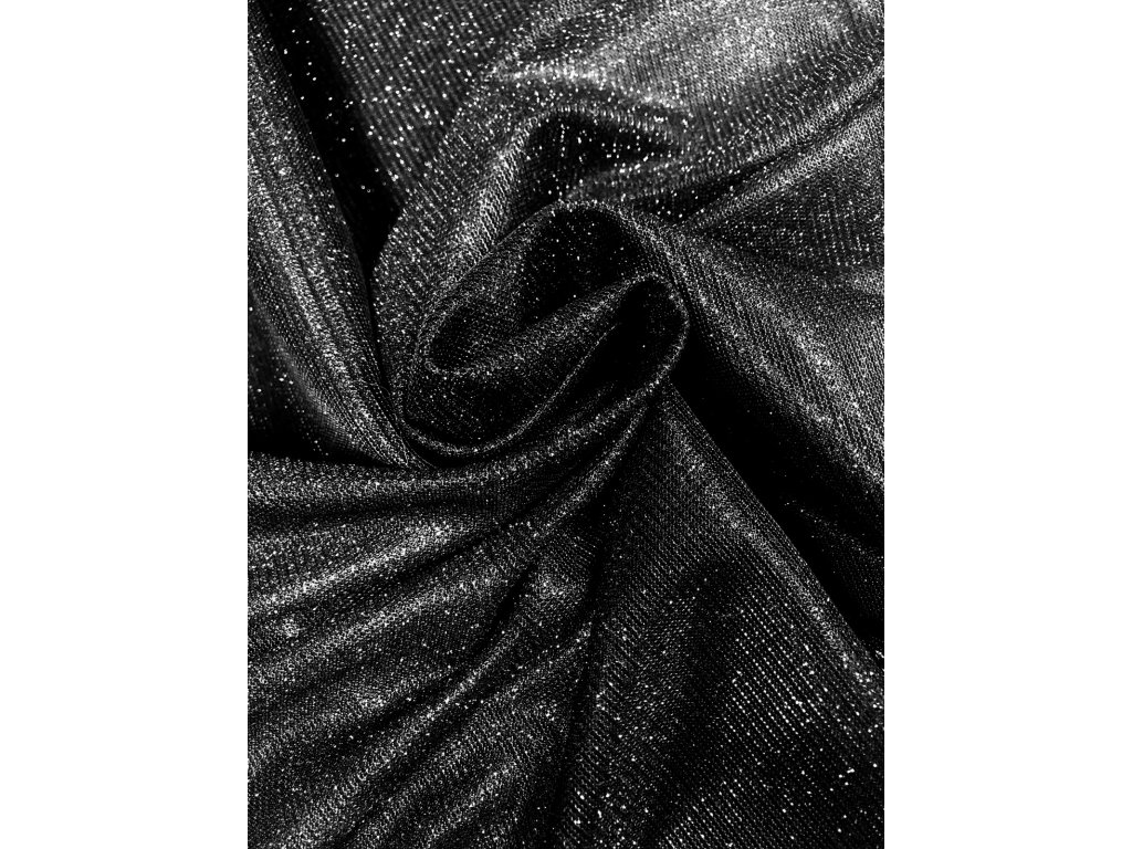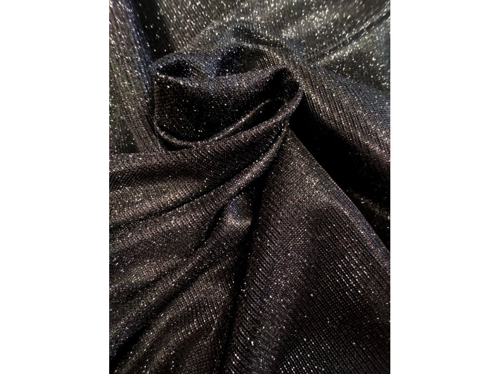 Elastická, černá, úpletová látka s lurexem. Neprůhledná a pevná látka střední gramáže. Táhne se jen jedním směrem k poutku. Lurex je jen s lícové strany. Rub je hladký a lesklý jako satén, velmi příjemný k tělu. Látka je nechytlavá a při nošení nebude dělat oka.