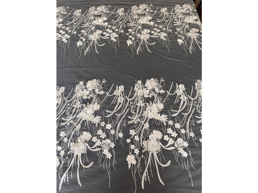 Tato měkká a jemná 3D svatební krajka s jemným zdobením - flitry, je ideální volbou pro návrháře, kteří hledají kvalitní a univerzální materiál příjemný na dotek. Díky své jednoduchosti a jemnosti je tato krajka vhodná pro vystřihování a aplikaci na různé části oděvů, jako jsou šaty, blůzy, nebo i intimní prádlo. Její měkkost a nedekorovaný povrch nabízí vyniknout jiným prvkům designu nebo lze snadno kombinovat s dalšími materiály pro složitější projekty.