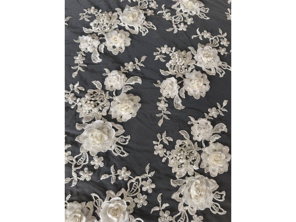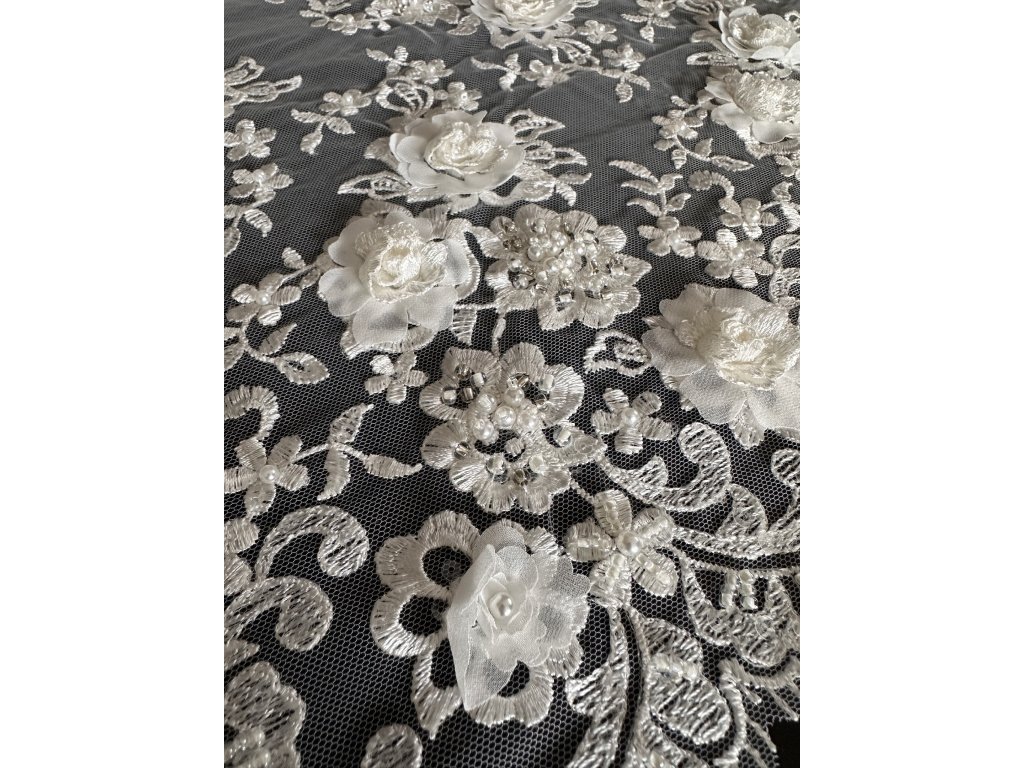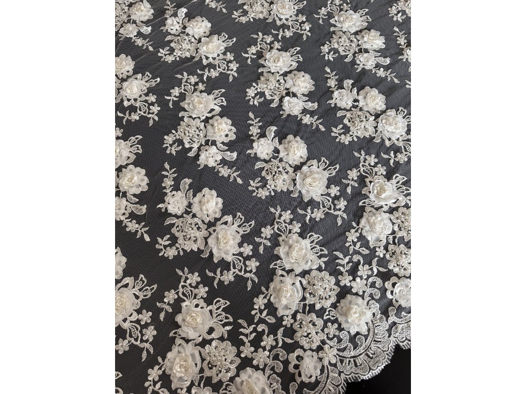 Tato krajka s hustým 3D květinovým vzorem přináší nejen vizuální bohatství, ale i texturovaný dotek k jakémukoli oděvnímu projektu. Celé plátno je detailně zdobeno perlami, korálky a flitry, což dodává každému kusu luxusní a oslňující vzhled. Kraj krajky je elegantně ukončen vlnkou po obou stranách, což znamená aplikaci a zvyšuje estetickou hodnotu.