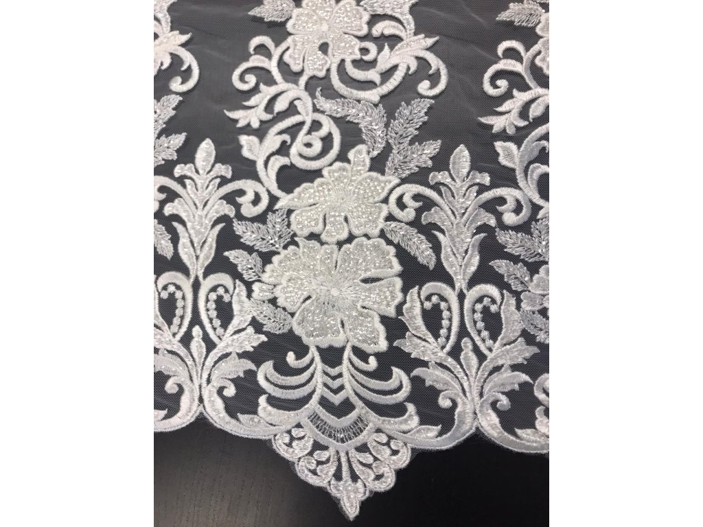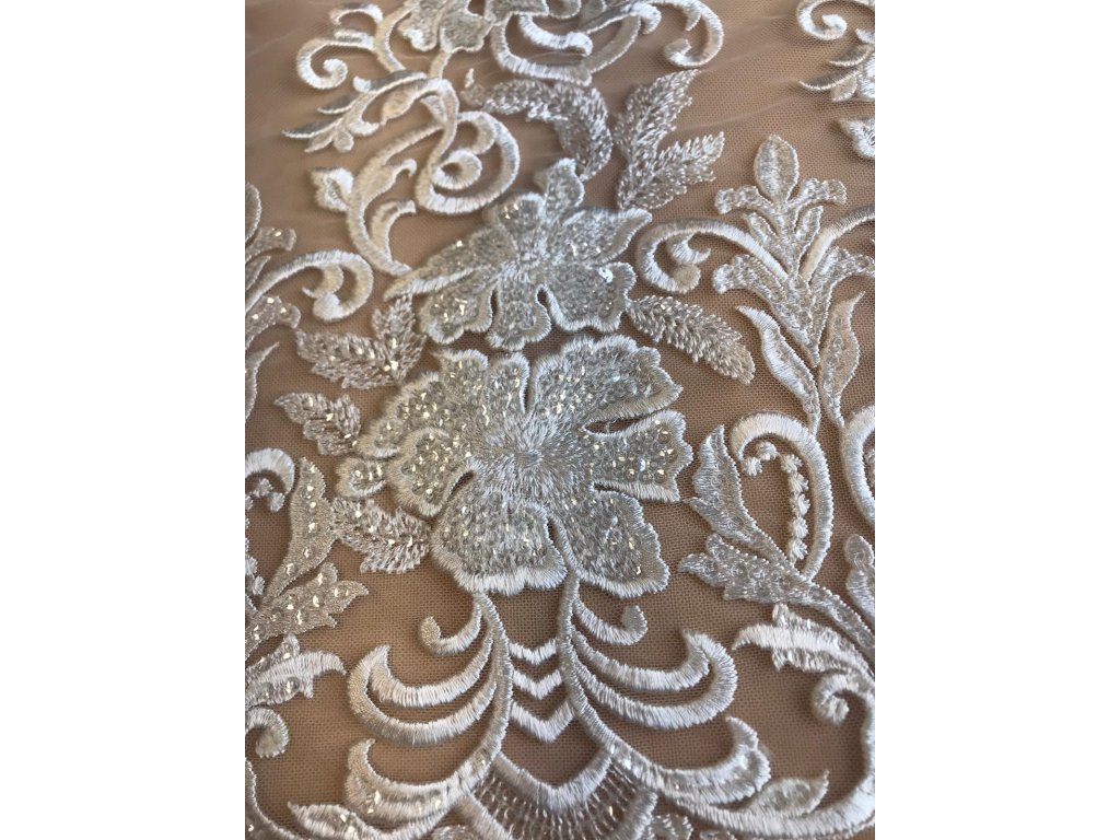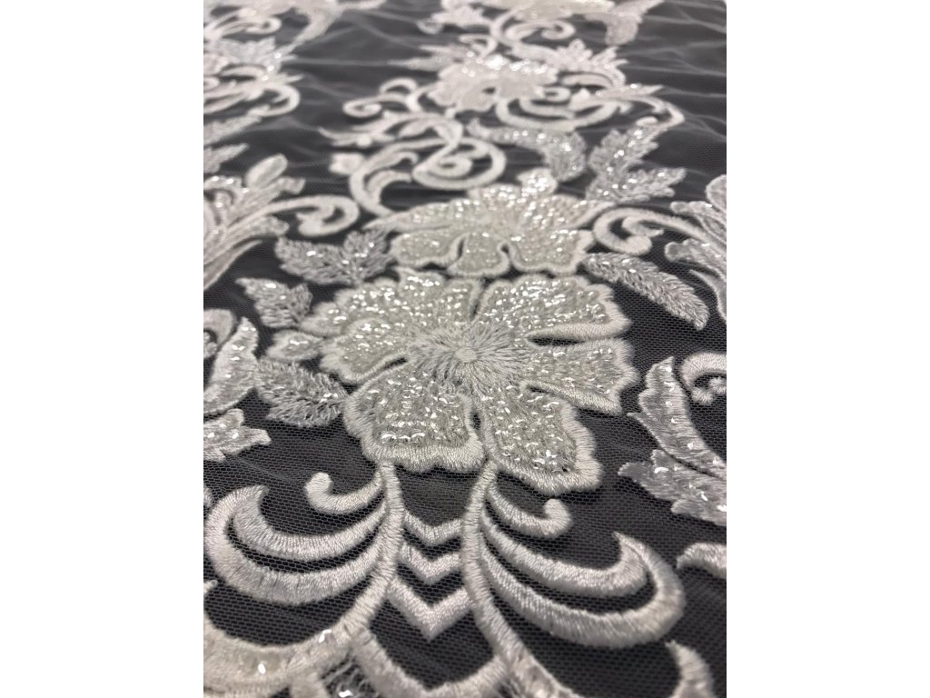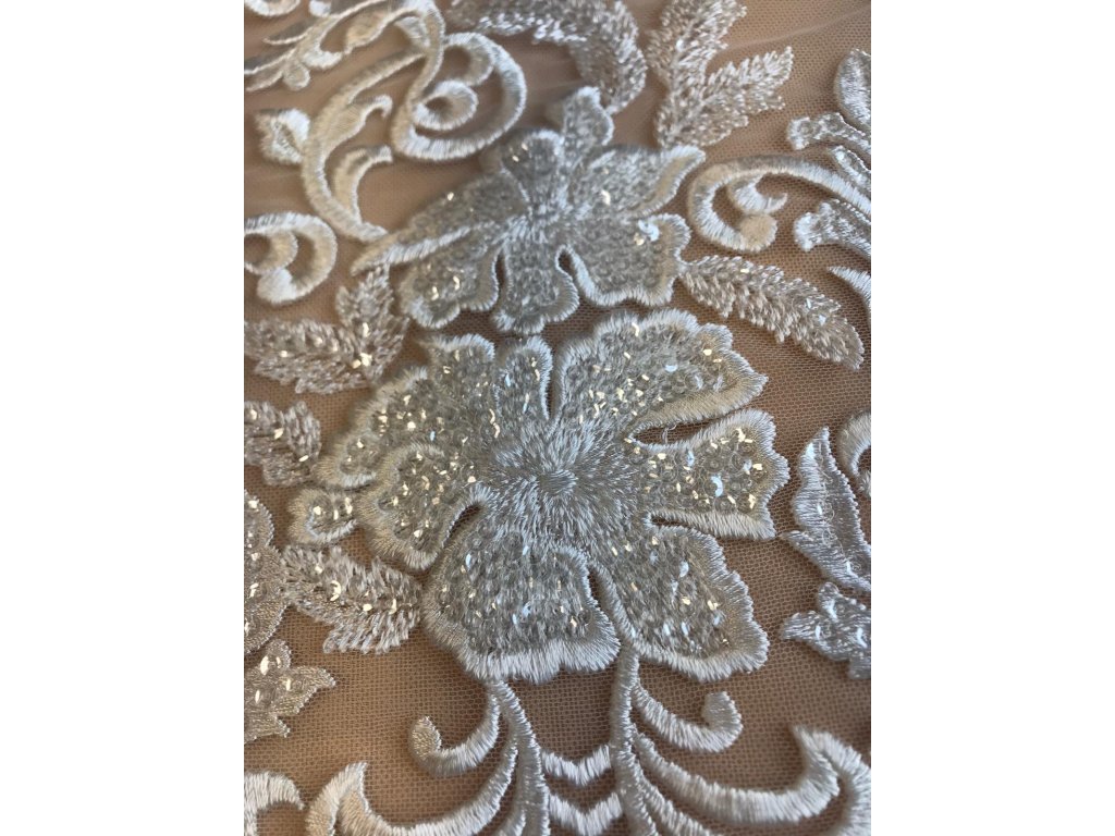 Tato nádherná výšivka na tylu, zdobená flitry s bordurovými okraji, je dokonalou volbou pro vytvoření luxusních oděvních kousků. Každý kuponový fragment látky je ideální pro vystřihování a aplikaci na různé části oděvů, což umožňuje designérům přidat výrazné a okouzlující detaily. Bordura přidáva sofistikovaný vzhled a okraje estetickou hodnotu celkového designu, zatímco flitry poskytují jemný třpyt a eleganci.