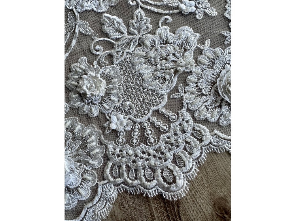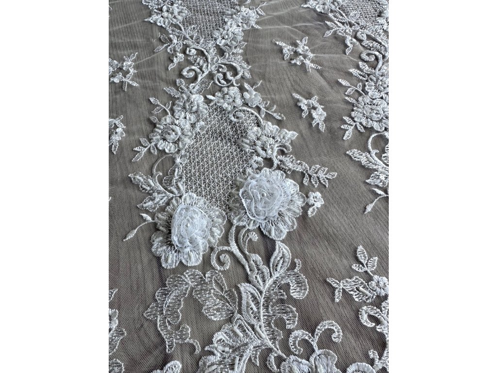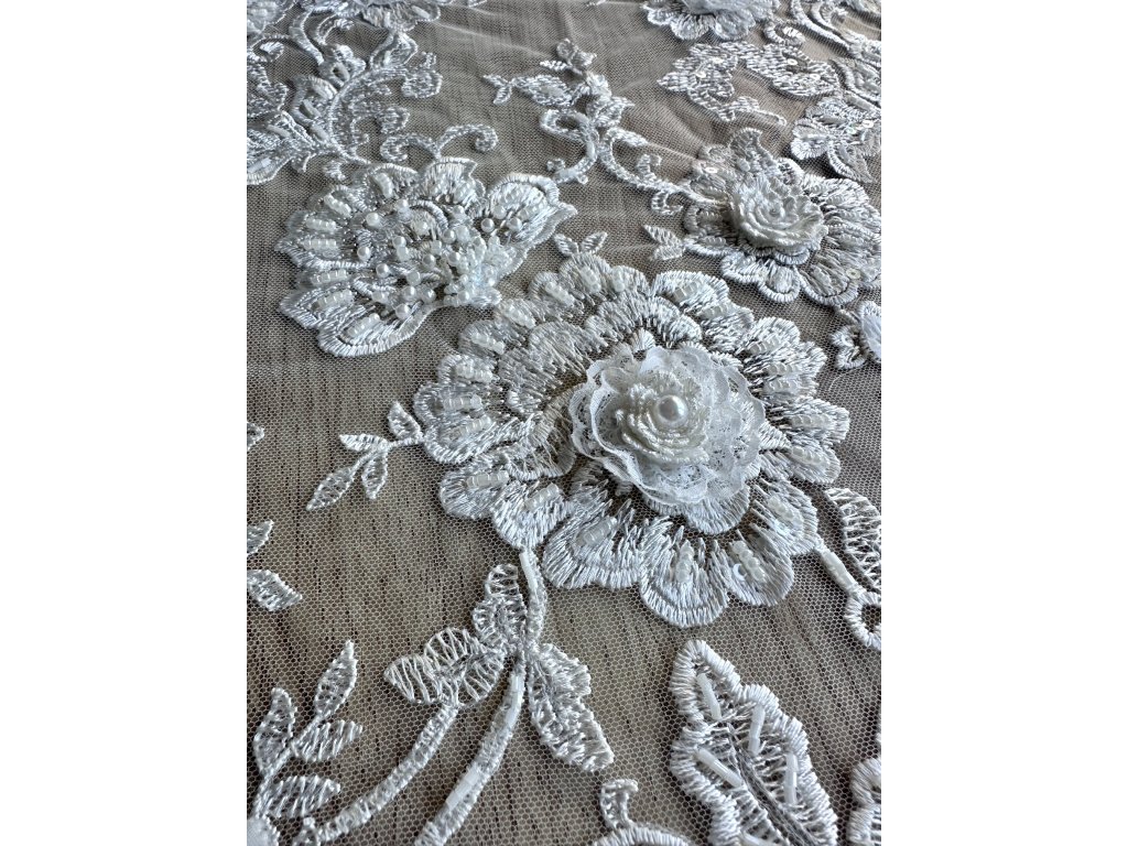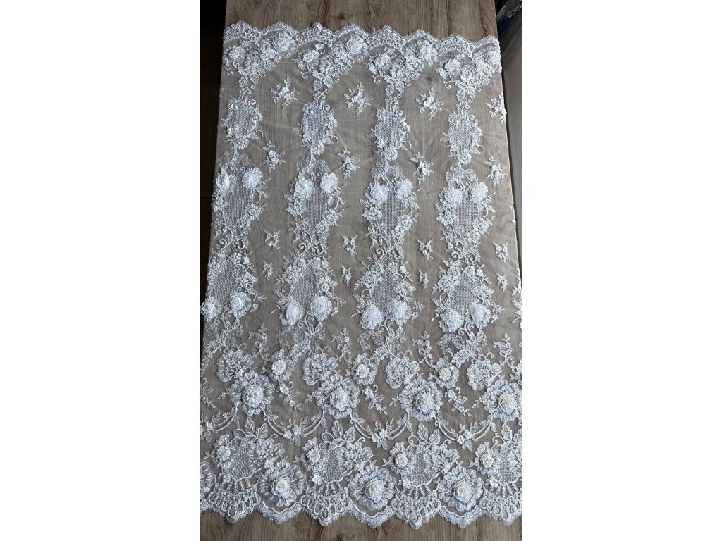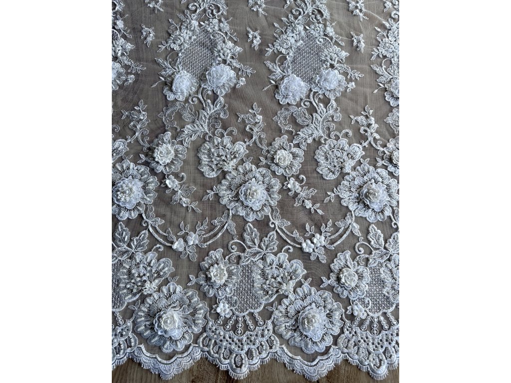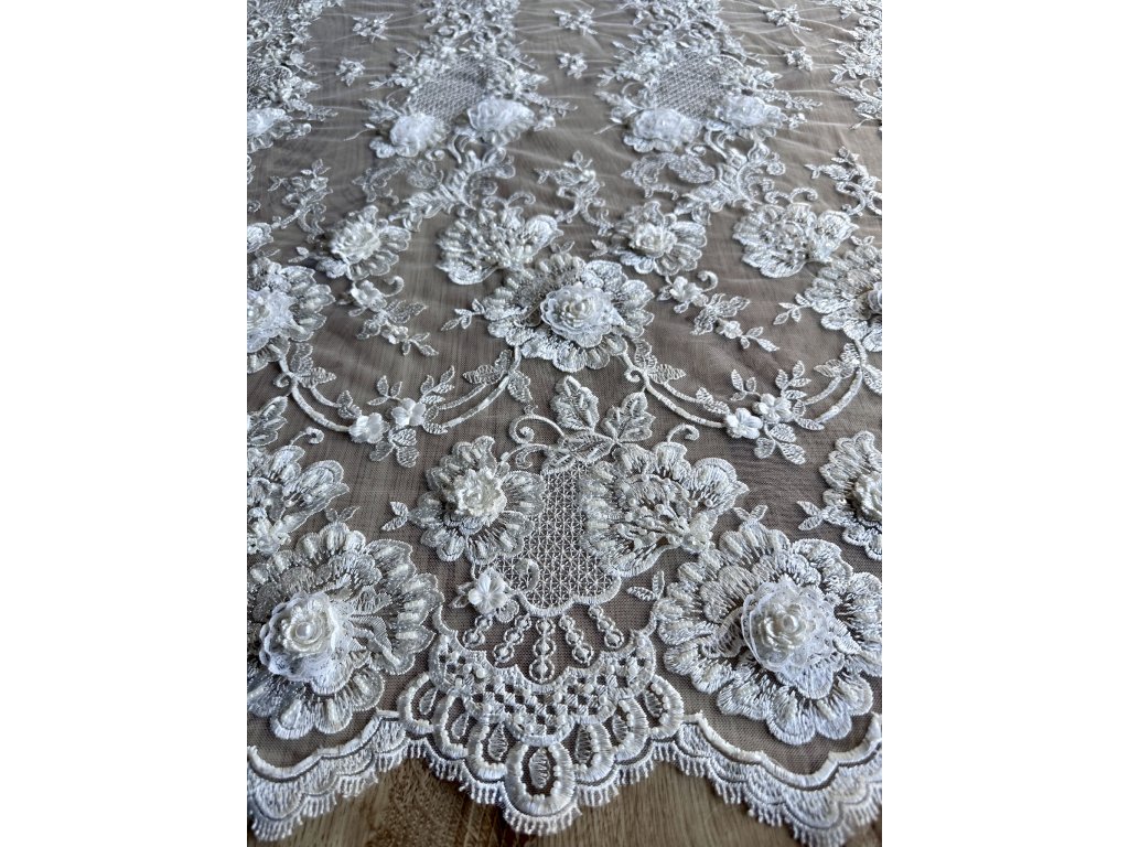 Tato jemná svatební 3D krajka se symetrickým vzorem květin přináší sofistikovaný a elegantní design, který je ideální pro vytvoření výjimečných oděvů. Symetrický květinový vzor dodává strukturovaný a harmonický vzhled, zatímco 3D zdobení poskytuje bohatý vizuální efekt a hmatovou texturu. Zakončení krajky vlnkou na obou stranách zvyšuje její estetickou hodnotu a nabízí aplikaci bez potřeby dalšího zpracování okrajů.