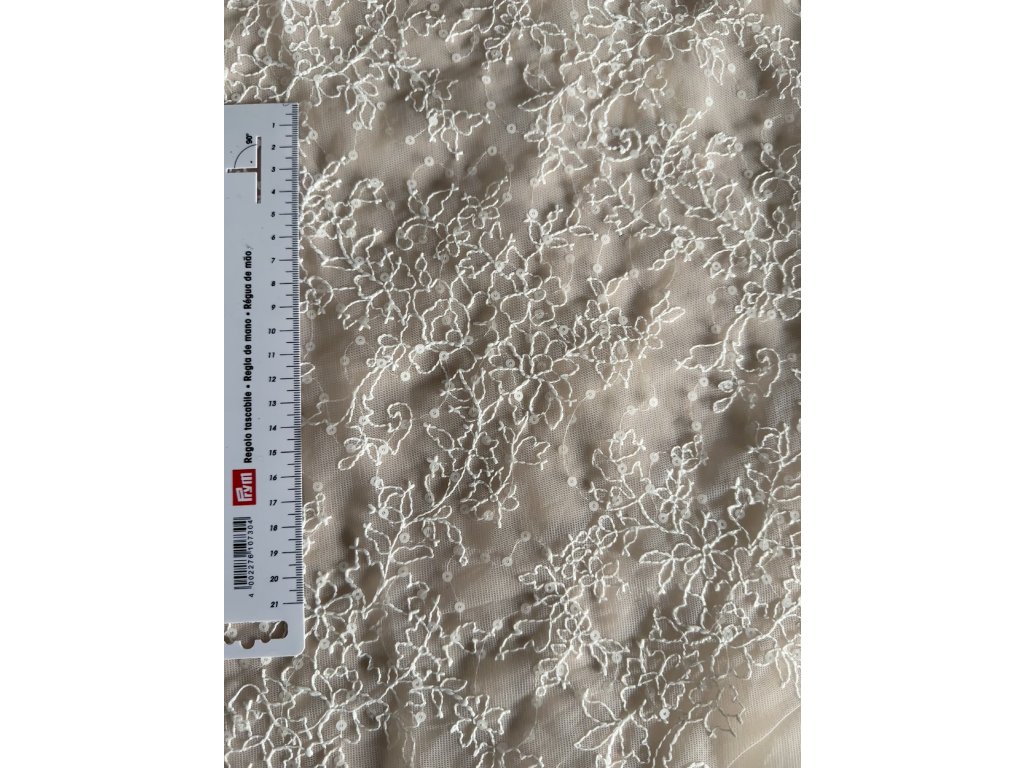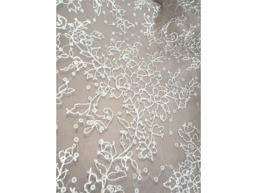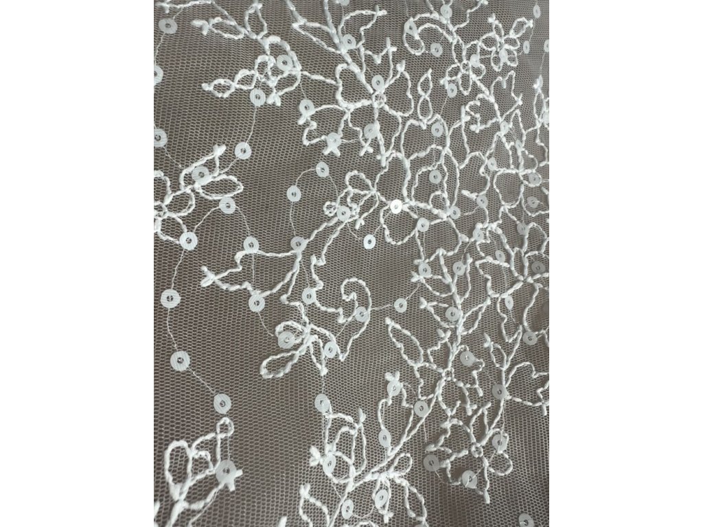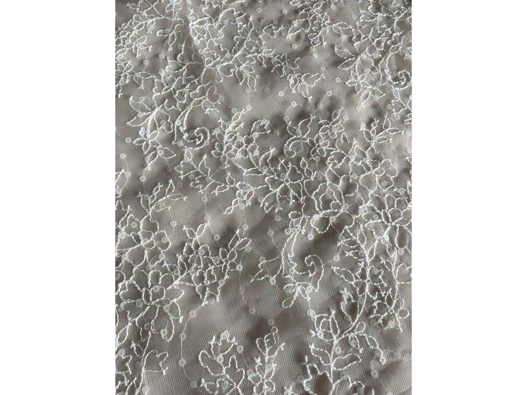 Tato výšivka na tylu, rozprostírající se na šířce 300 cm, nabízí bohatý květinový vzor zdobený flitry, což jí dodává oslnivý a luxusní vzhled. Je ideální pro tvorbu extravagantních svatebních šatů nebo jako hlavní prvek ve večerních róbách. Tato široká výšivka umožňuje plně pokrýt velké plochy bez fotografie spojování, což zajišťuje plynulý a souvislý design. Flitrová zdobení nejen zvyšuje její estetickou hodnotu, ale také přidává třpytivý efekt, který krásně reaguje na světlo.