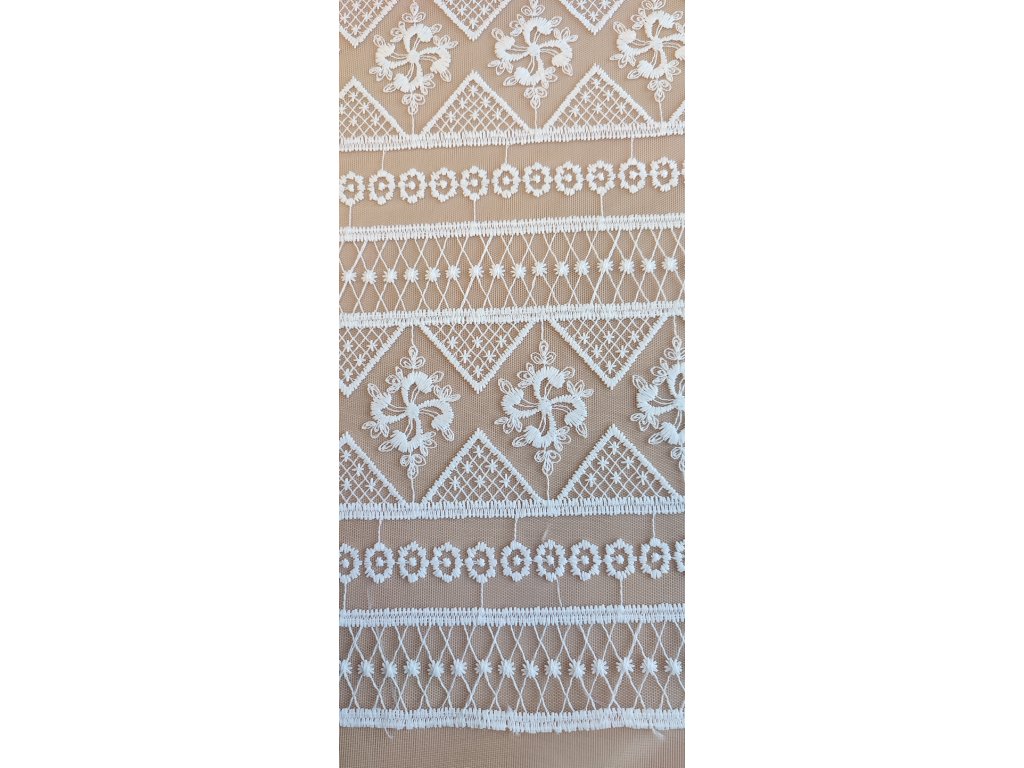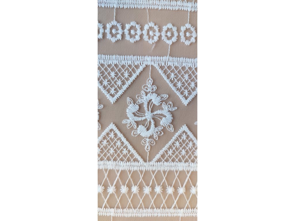 Jemná krajka s výšivkou na tylu, ve folklorním stylu, bez zdobení.