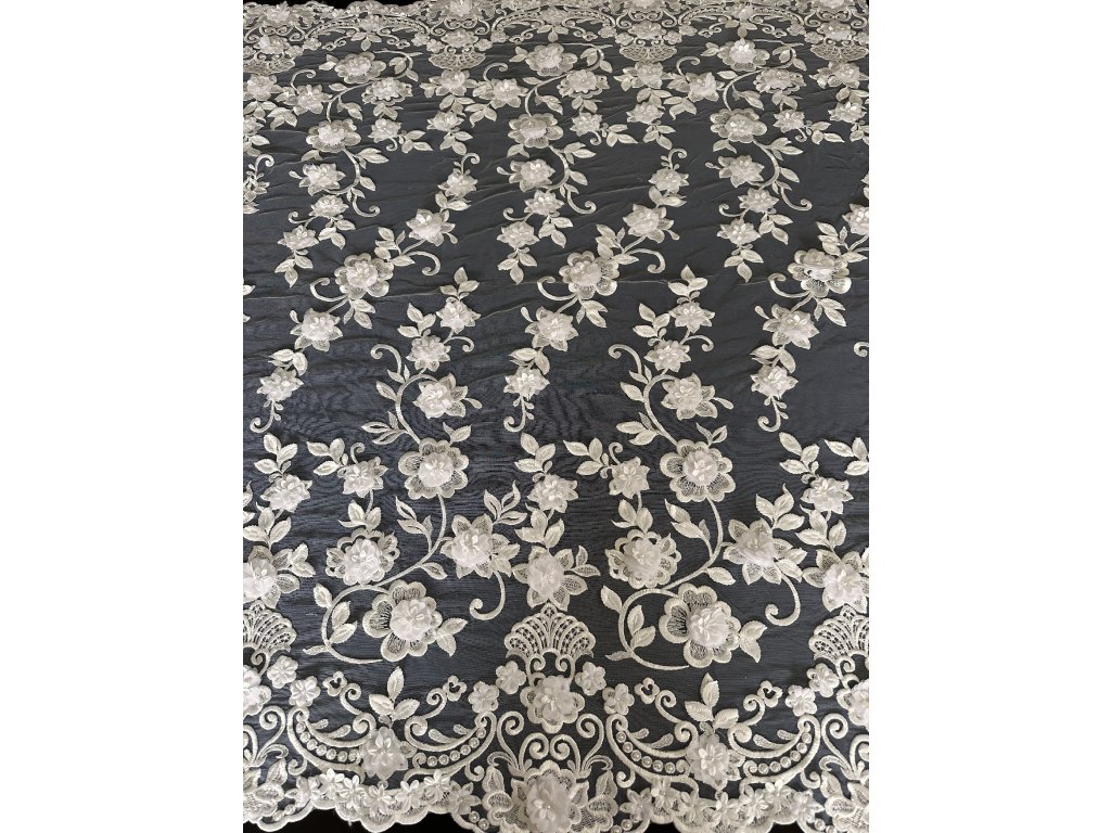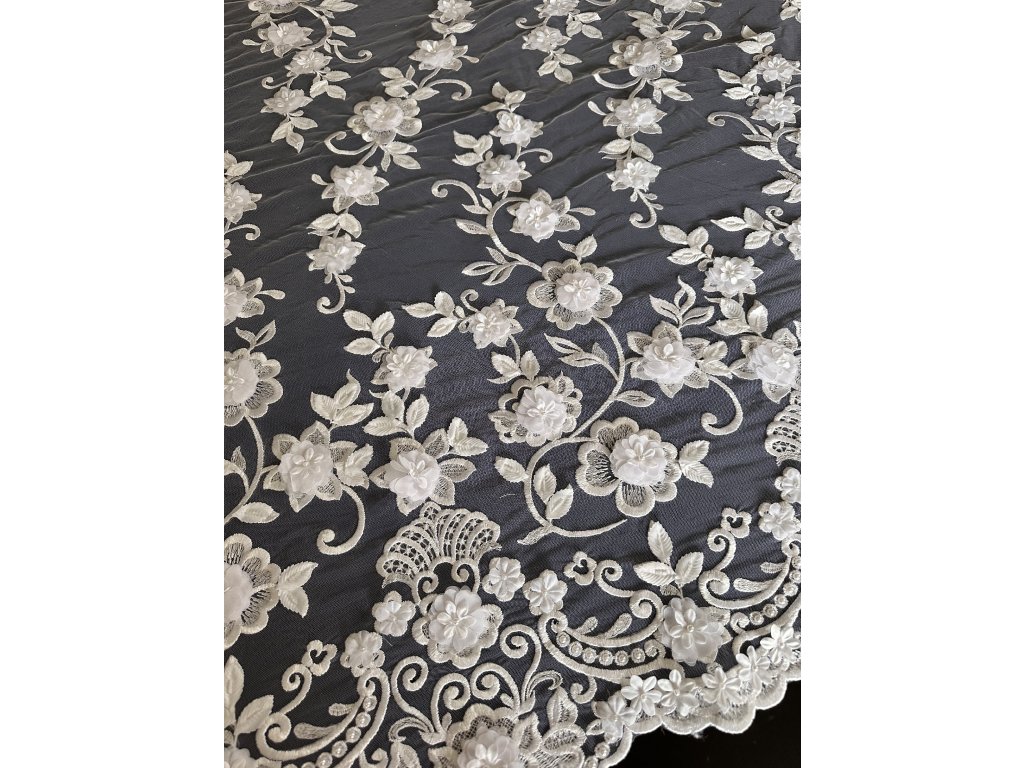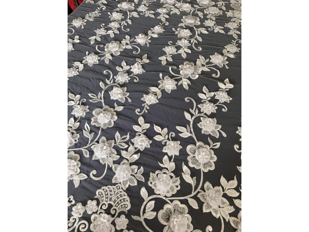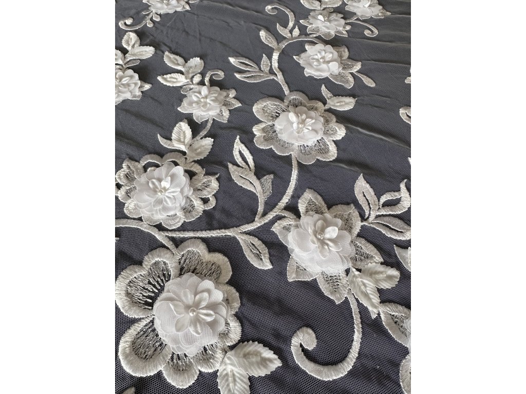 Tato romantická 3D krajka s motivem květů po celé ploše je dokonalým vyjádřením elegance a jemnosti. Květinový design přináší na povrch krajky živé a plastické textury, což dodává každému oděvnímu kusu výjimečný vizuální rozměr. Tato krajka je ideální pro svatební šaty, večerní šaty a další slavnostní oděvy, kde je žádoucí romantický a vysoce estetický vzhled.
