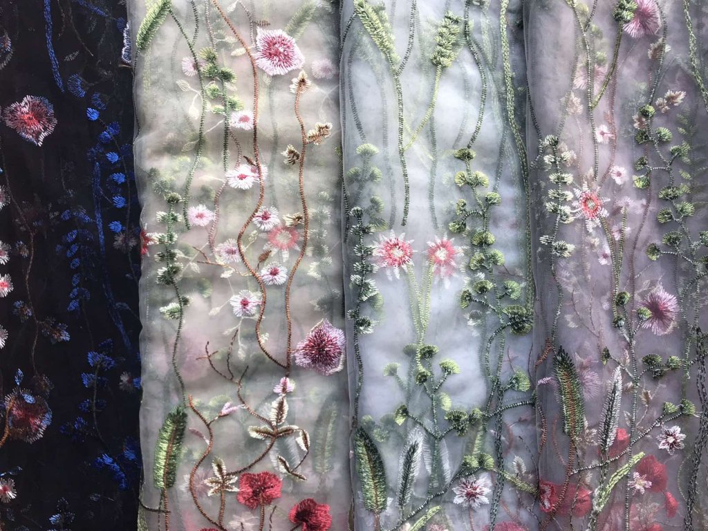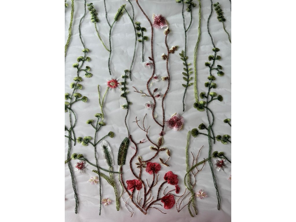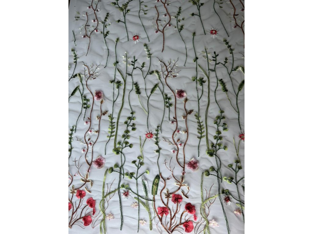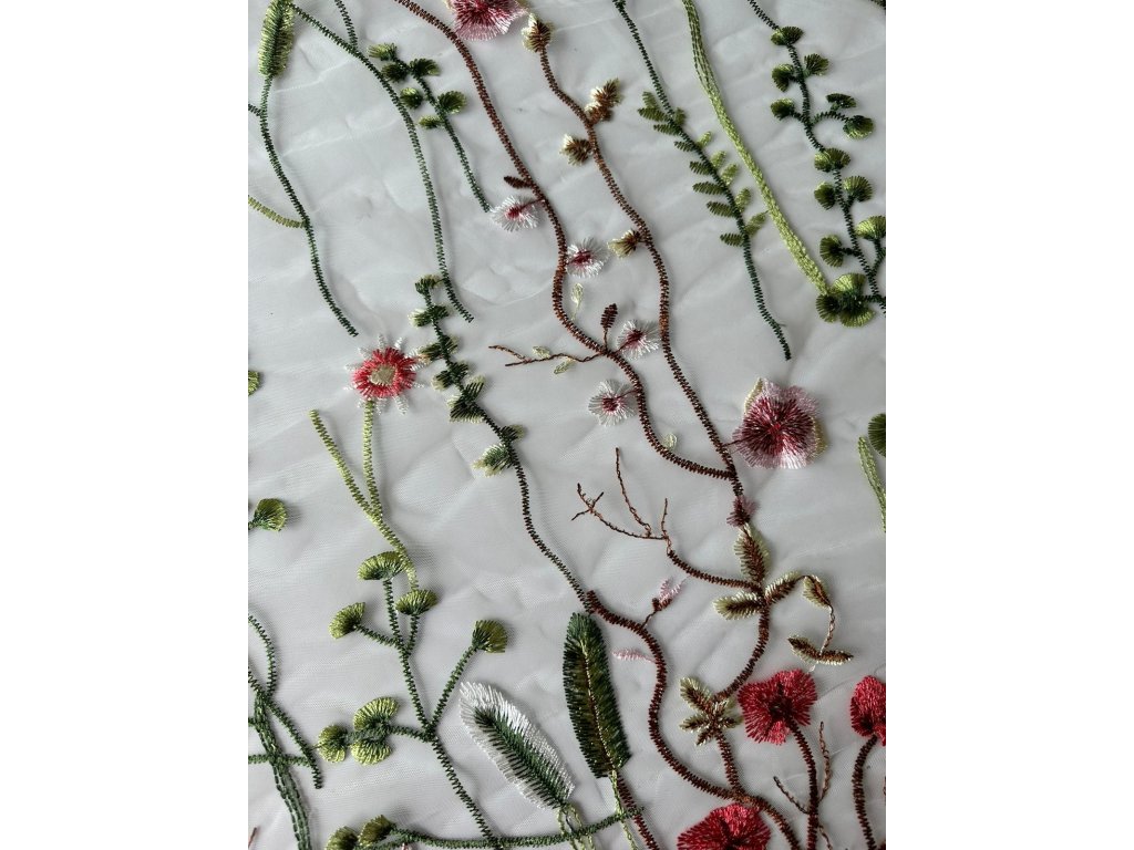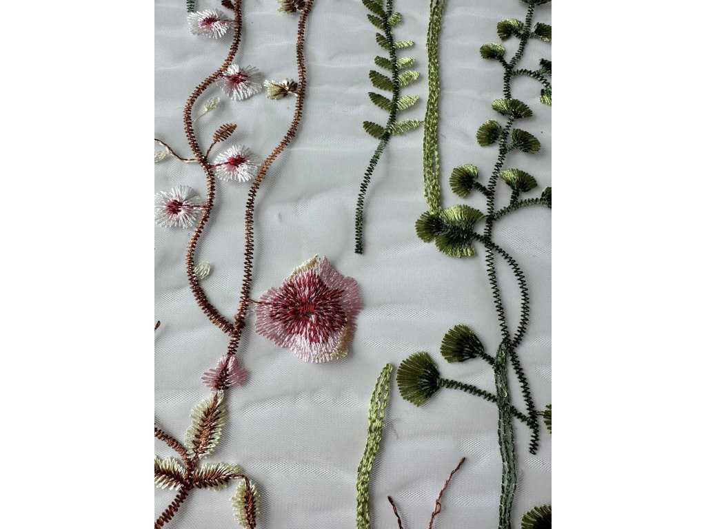 Jemná a vzdušná výšivka na tylu se vzorem rozkvetlé louky.